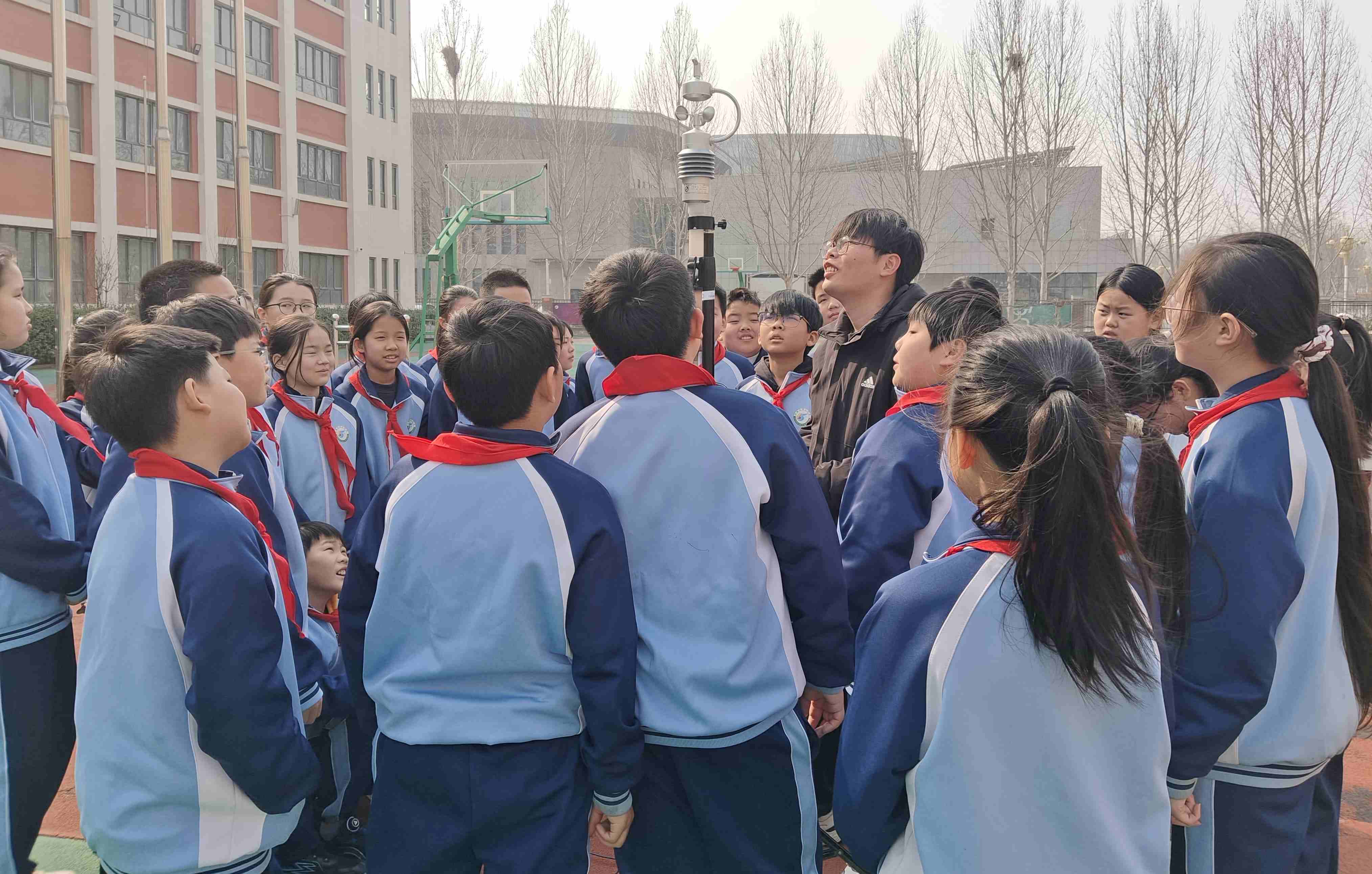 活动现场,气象局的科普志愿者带领同学们实地参观便携式自动气象站,了解温度、气压、湿度、风向、风速等各气象要素的收集过程,让学生们近距离观察仪器,亲手触摸观测设备。现场组织学生线上浏览“河北省气象数字科普展馆”,为学生们赠送《中小学生气象灾害避险手册》,手册图文并茂,系统介绍了常见气象的成因、预警信号及避险自救方法,讲解如何加强雷电灾害防御等气象知识,提升学生们的安全防范意识和应急避险能力,为学生提供了实用的防灾指南,激发了学生探索气象科学的兴趣。