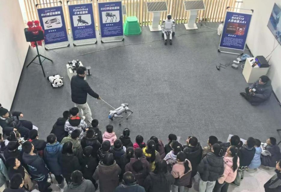 竞赛之余,科普研学实践区成为孩子们的“打卡胜地”。这里设置了人形机器人、机器狗互动区、无人机应用区、赛车体验区、无人机体验区等五大体验区,让科技触手可及,通过沉浸式体验、动手操作和导师讲解,孩子们在玩中学、学中悟,科学素养与实践能力悄然提升。