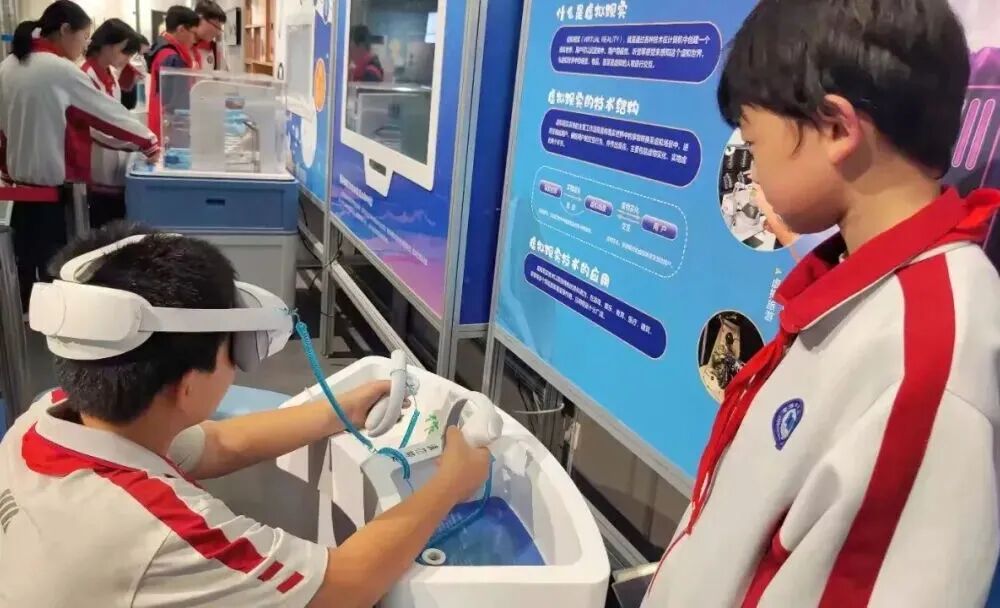 同学们站在“年代空调墙”前,开启穿越时空的“冷暖”之旅。1950年代国产窗机与新一代光伏直驱空调并肩陈列,讲述着中国制造从“跟跑”到“领跑”的跨越。流动科技馆共设有三个展区,分别是美丽数学、科技慧生活、改变世界的材料,展区内有“智慧医疗”“VR”“智慧分拣”“云计算”等科普装置,让大家直呼“大开眼界”。