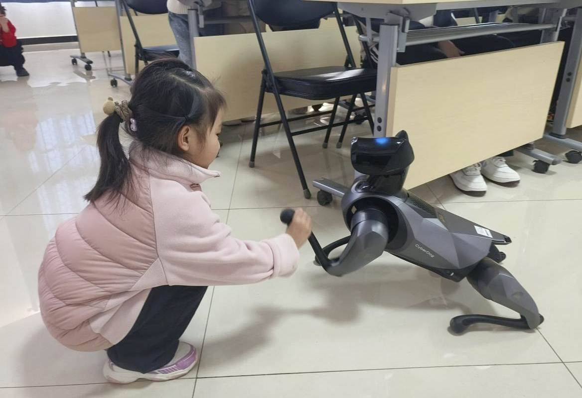 活动伊始,讲解员以“机器狗如何像真狗一样行动?”为切入点,用通俗易懂的语言,结合实物零件和动态演示,向参与者讲解机器狗的基础构造、传动原理和传感器工作逻辑,逐一介绍齿轮、电机、支架、电路板等部件的作用,将复杂的机械与电子知识转化为生动有趣的科普内容。同时,通过展示灵活运动的成品机器狗,演示前进、转向、摆臂等动作,引发参与者的浓厚兴趣,大家睁大眼睛认真聆听,主动举手提问,求知热情格外高涨,在轻松的氛围中搭建起基础的科技知识框架。