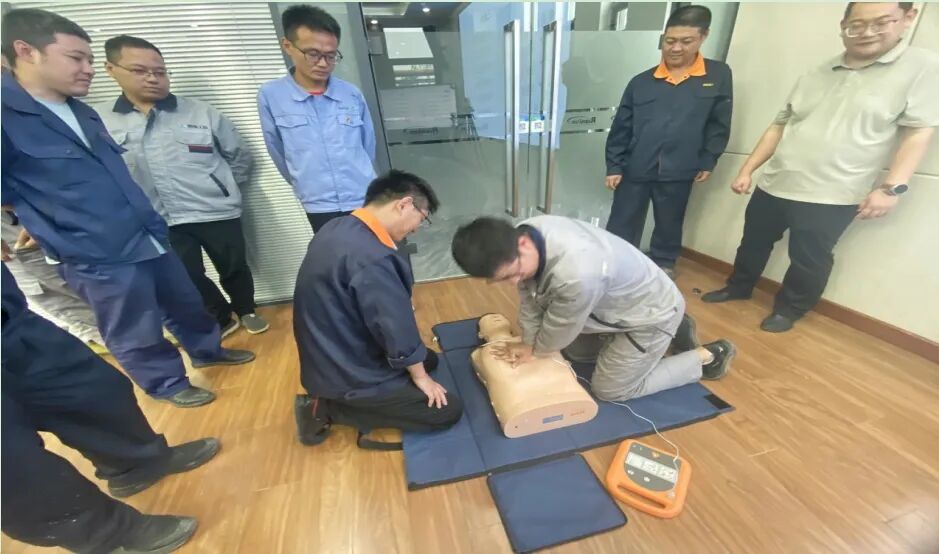 活动现场,科普老师结合企业工作场景,通过“理论+实操”的方式,分阶段推进应急救护知识的传递。在理论科普环节,科普老师拆解应急救护核心知识,围绕心肺复苏(CPR)操作流程、自动体外除颤器(AED)使用方法到气道异物梗阻的自救他救方法以及创伤出血止血包扎方法等核心内容展开授课。在实操环节,组织员工分组练习,科普老师逐组指导、纠正不规范操作,确保所有人都能掌握真正的急救方法。